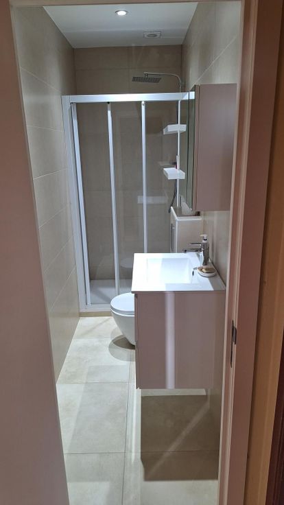 - 1 salle de bain avec douche, lavabo et WC