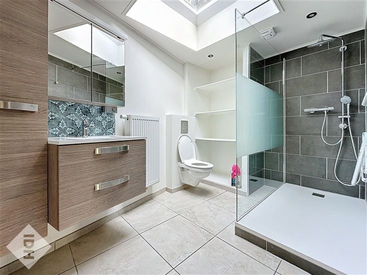 Salle de bain avec douche, meuble lavabo et WC.
