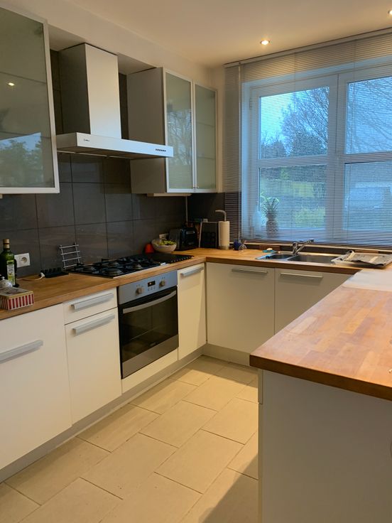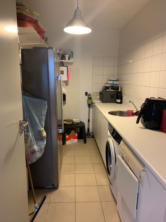 De keuken beschikt over een gasfornuis en ruimte voor een vaatwasser. Aansluitend bevindt zich een praktische berging met een extra aanrecht en aansluitingen voor een wasmachine en droogkast.