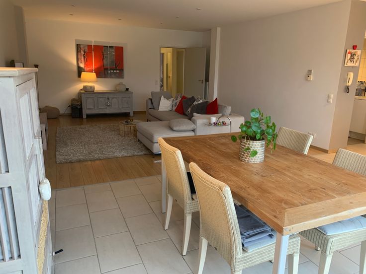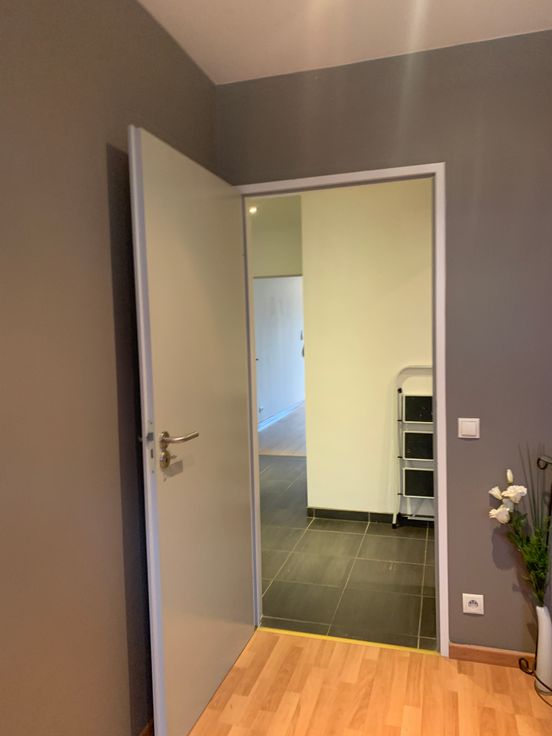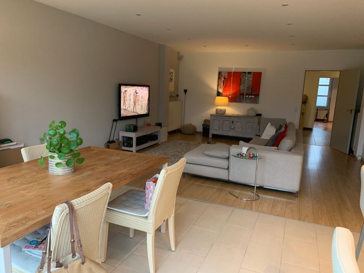 De open leefruimte met keuken is ideaal georiënteerd op het zuiden. Dankzij een groot schuifraam geniet de woonkamer van veel natuurlijk licht en toegang tot een privé tuin van 50 m² met terras, waar u vanaf de middag van de zon kunt genieten.