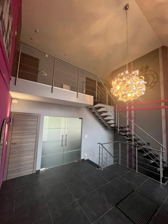 Un prestigieux hall d’entrée avec mezzanine comprenant des toilettes visiteurs et pièce séparée pour le vestiaire. Un bureau et une chambre avec salle de douche privative.