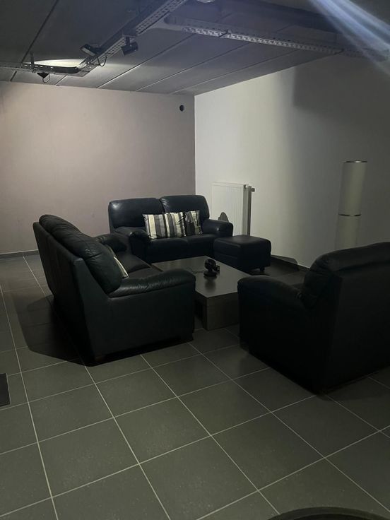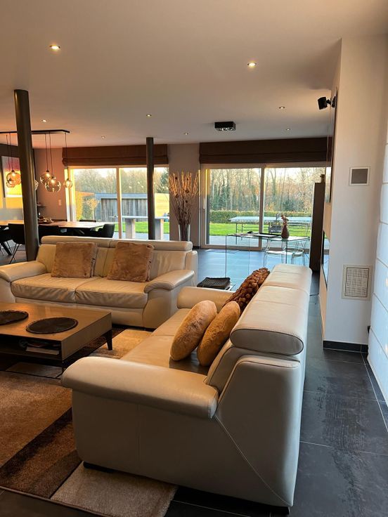 L’espace de vie est spacieux et lumineux grâce à de grandes baies vitrées qui donnent sur le jardin, foyer au gaz Bodart & Gonay