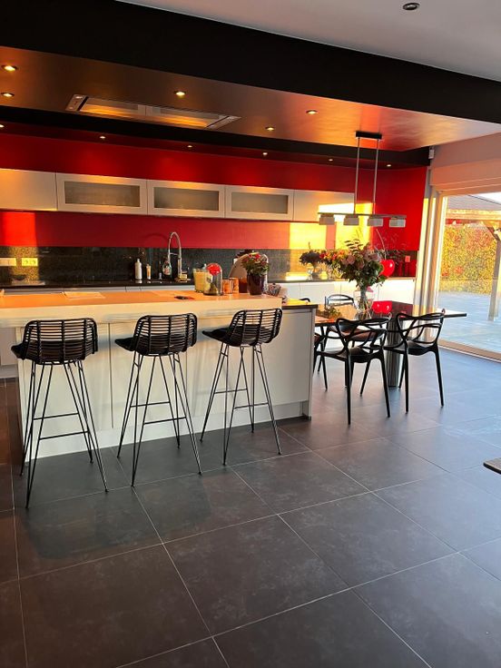 La cuisine entièrement équipée avec îlot central, coin à déjeuner offrant également une vue sur le jardin.