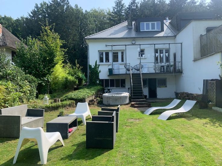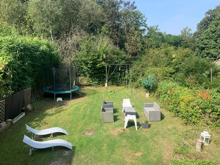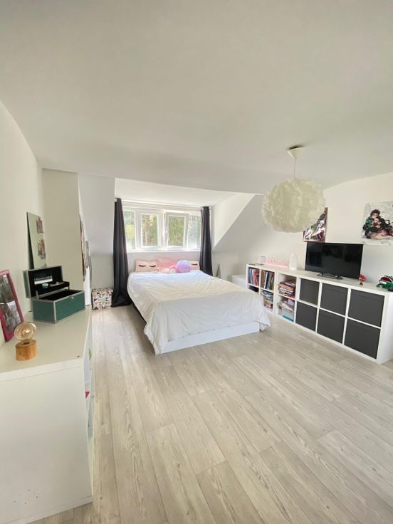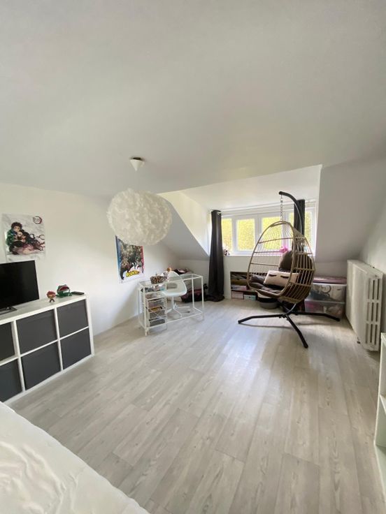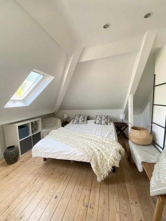 A l'étage supérieure on retrouve une deuxième chambre de 25m² avec vue sur le jardin, d'un bureau et de rangement.
