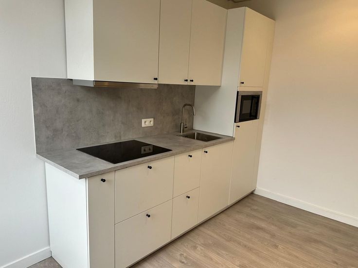 Vernieuwde studio met open keuken, aparte slaapkamer en doucheruimte met douche, toilet en lavabo.