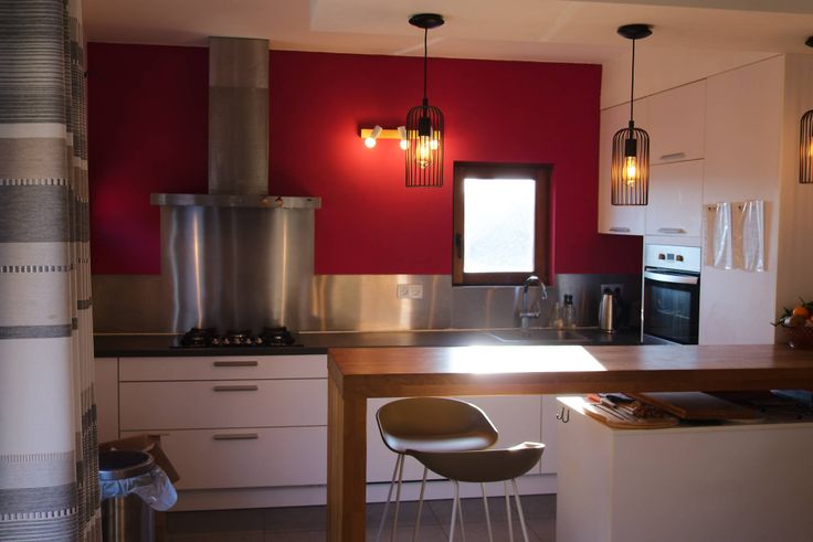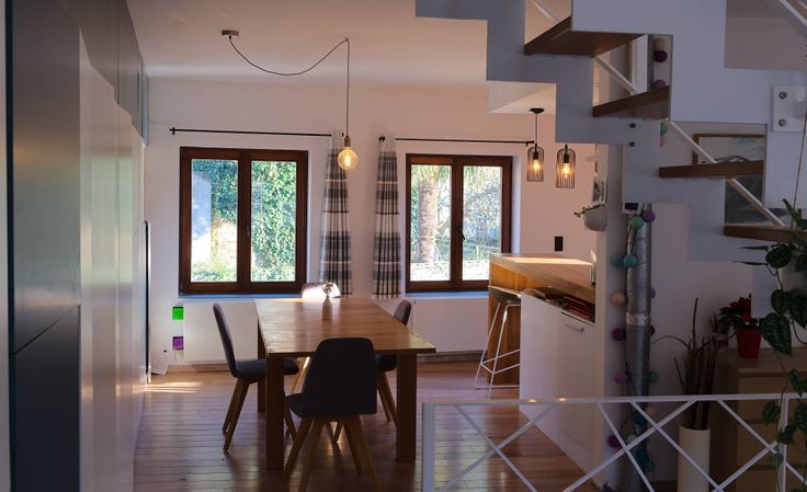 - Étage 3 : grande pièce de vie ouverte reprenant une cuisine équipée (8m2), un salon (13m2) et une salle à manger (14m2).
