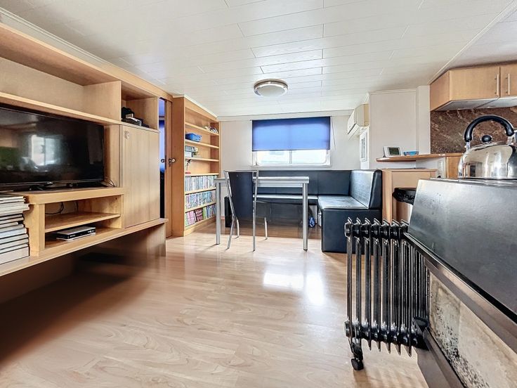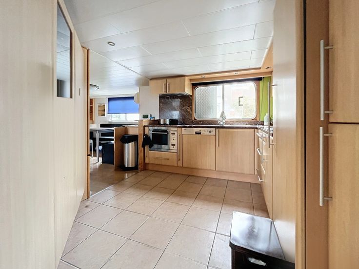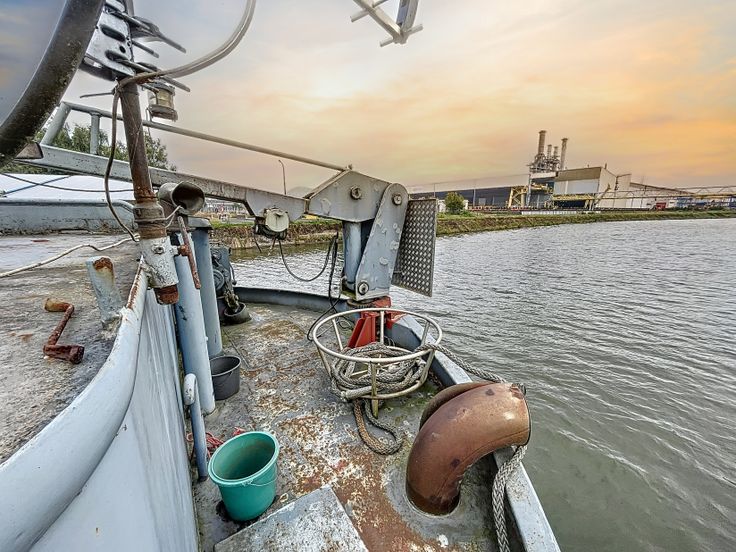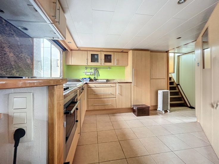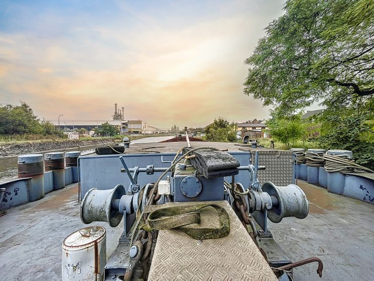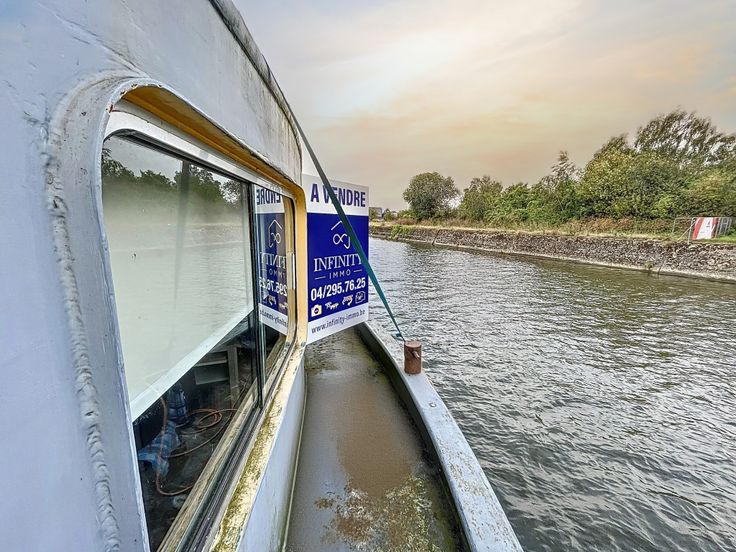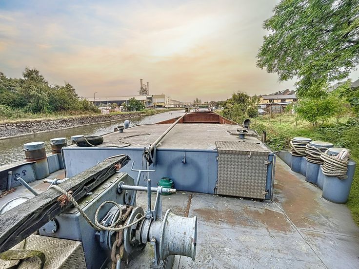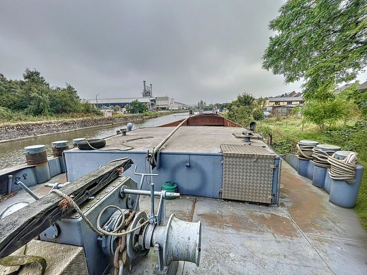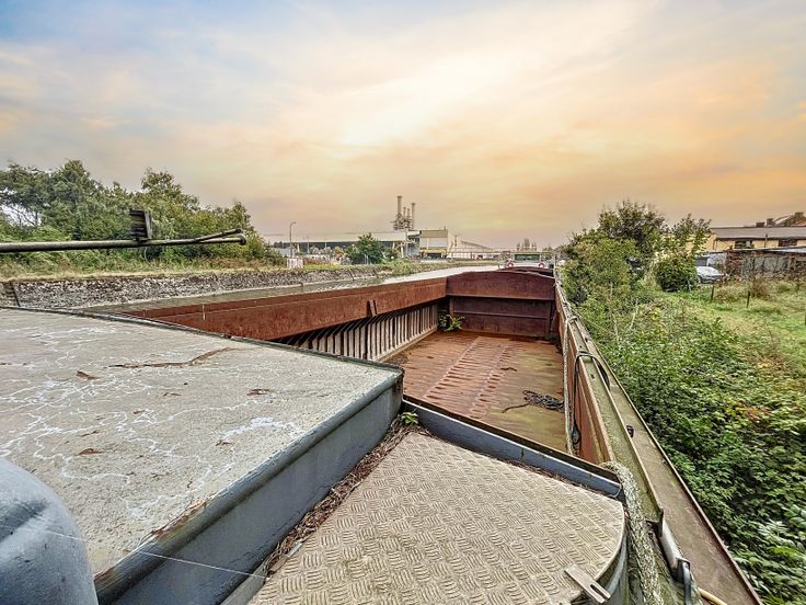Péniche à vendre de 67 mètres de long sur 8 mètres de large avec une hauteur hors de l'eau de 4,5 mètres.