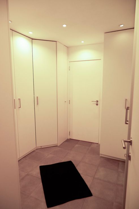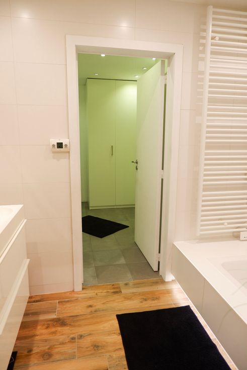 Op het gelijkvloers kom je binnen in de gang die uitkijkt op de wasplaats, neem de deur rechts en je komt binnen in de dressing die je doorloopt en zo de badkamer betreedt met bad en inloopdouche. Er is ook een toilet voorzien en een grote garage.