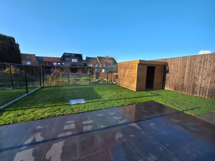 Er is een groot terras voorzien. De tuin is volledig omheind en toegankelijk via een tuinpoort.