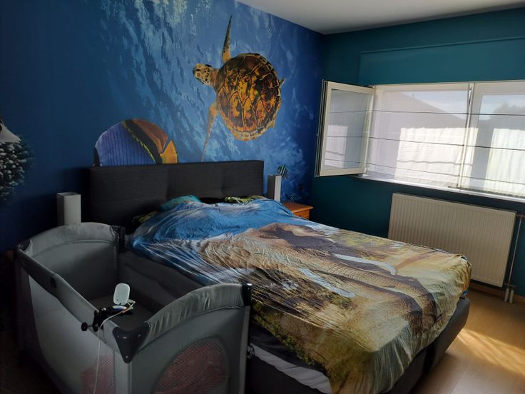 Bij het binnenkomen in de hal, hebben we de eerste slaapkamer (momenteel gebruikt als opslagplaats voor speelgoed) links.
