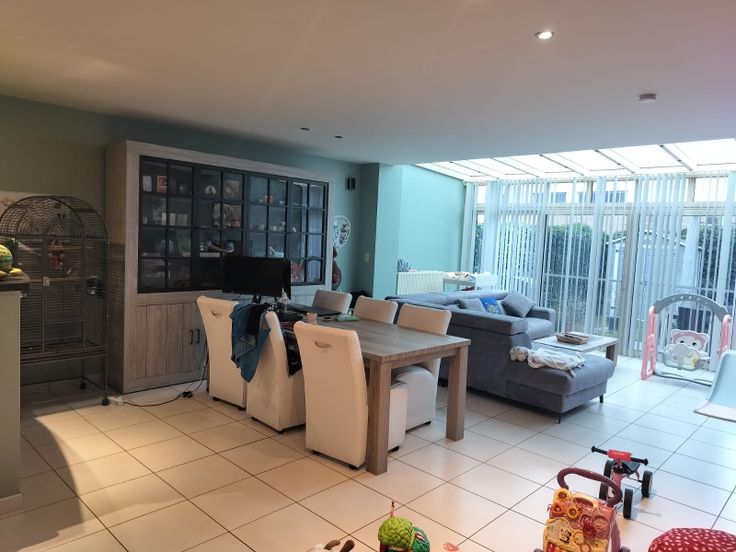 De living loopt uit in een veranda die, via een groot schuifraam, toegang geeft tot de tuin. Heerlijk vertoeven in het licht en in de veranda met gezellig achtergrondgeluid tijdens de regen.