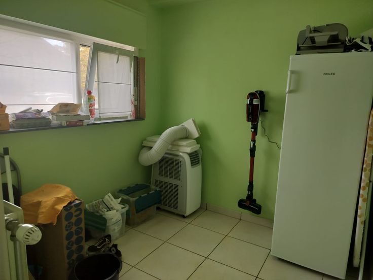 Rechts hebben we een toilet + een handige berging onder de trap, uitgerust met alle meters, de installatie voor het regenwater (regenput in de tuin van 5000L) en de aansluitingen voor de wasmachine op regenwater.