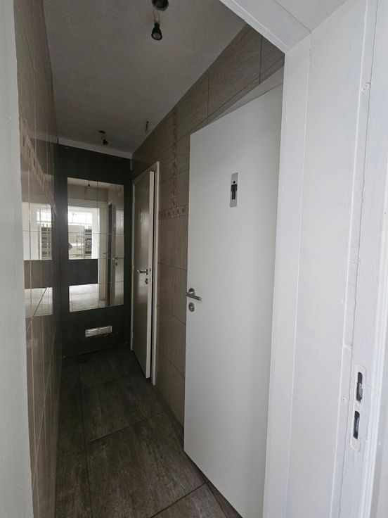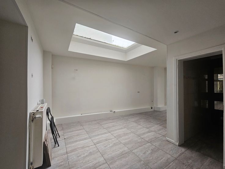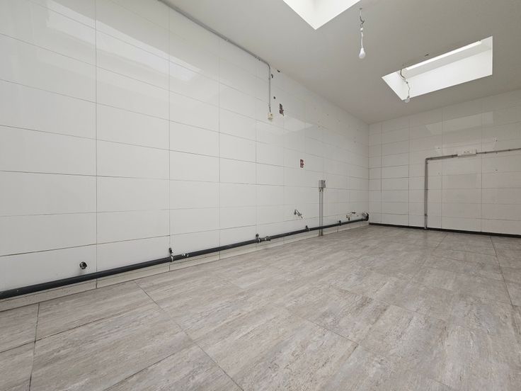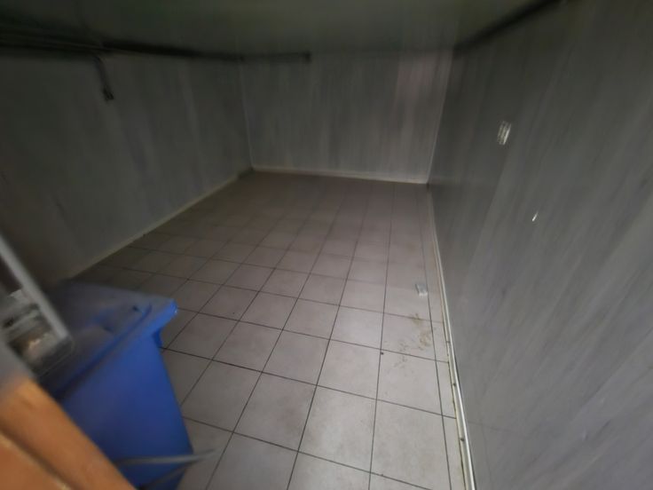 Ruime ruimte vooraan, dubbele toiletgroep, tussenruimte, achteraan grote ruimte met toegang tot de private kelder.