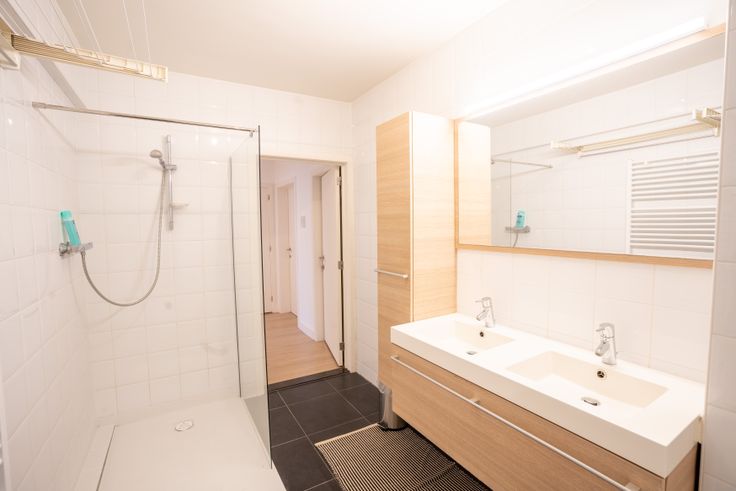 Badkamer met zowel een ligbad als inloopdouche en dubbele wastafel. Apart toilet en handige bergruimte met wasmachine.