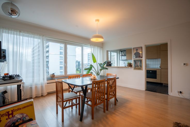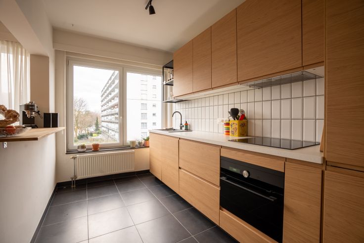 Het appartement van 108m2 heeft een ruime en lichtrijke woonkamer die naadloos overgaat in de volledig nieuwe moderne keuken. De nieuwe open keuken is volledig uitgerust met moderne toestellen, waaronder een combi- oven, kookplaat, koelkast en vaatwasser.