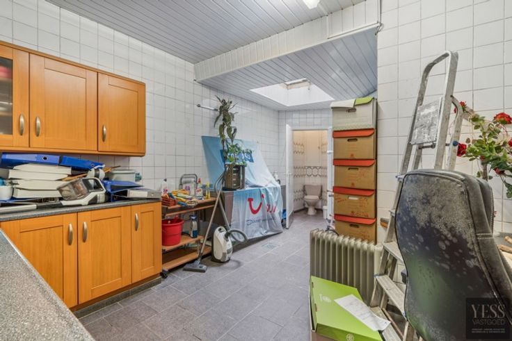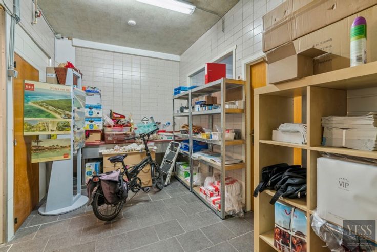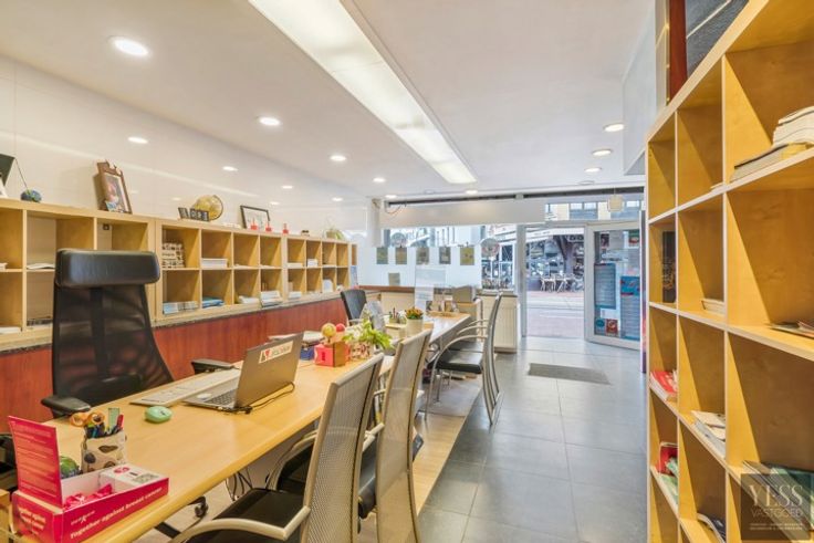 Op de benedenverdieping vinden we een handelspand dat momenteel verhuurd was tot juni 2024. Het handelspand is als volgt ingedeeld: een ruime ontvangst- en bureauruimte met veel lichtinval dankzij de grote etalage. Achterin het pand is een multifunctionele ruimte met een keukentje, momenteel in gebruik als opslagruimte en een afzonderlijk toilet.
