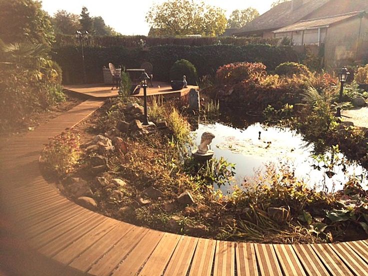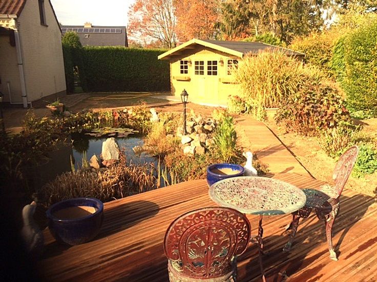 De living met glazen deuren geven uit op een ruim overdekt terras met bankirai vloer, tuin met vijver en tuinhuis.