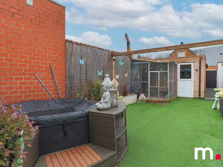 Zeer onderhoudsvriendelijke tuin met grote tuinberging (nu mancave) en garage met uitweg.