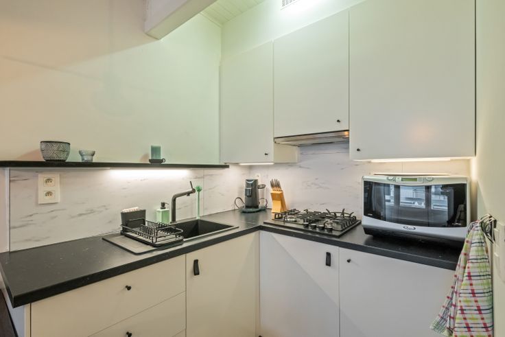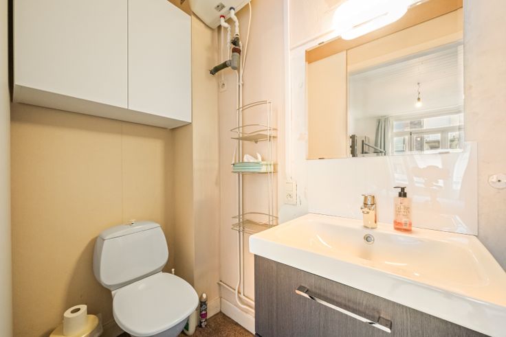Deze open keuken en de ruime, lichtrijke woonkamer vormen het hart van het appartement, waardoor het een uitnodigende ruimte is om te ontspannen. Het appartement is verder voorzien van een badkamer met douche en toilet. Deze badkamer dient nog eens opgefrist te worden.