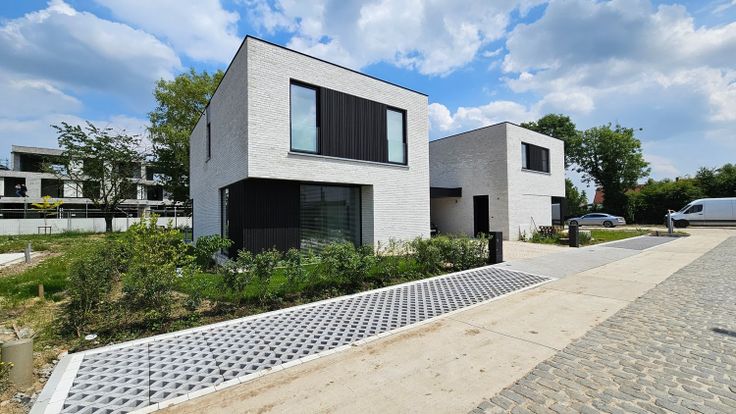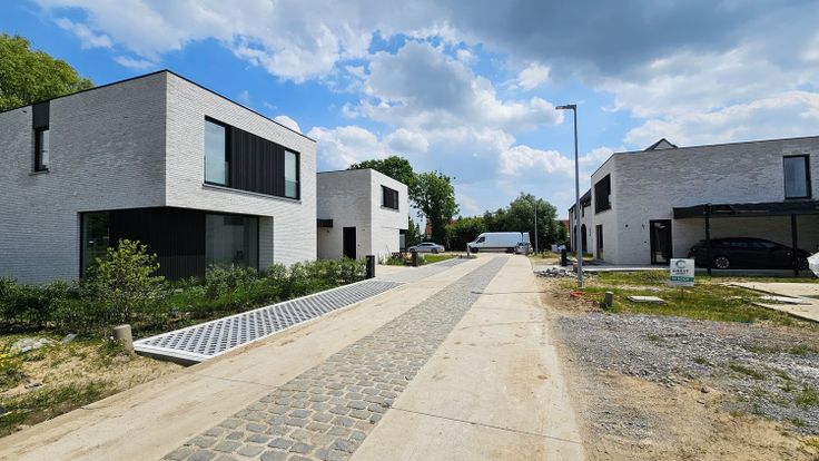 Een kasseistrook in het midden van het betonnen karrespoor verbindt een mix van moderne en landelijke woningen en dit met een knipoog naar het verleden.