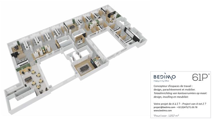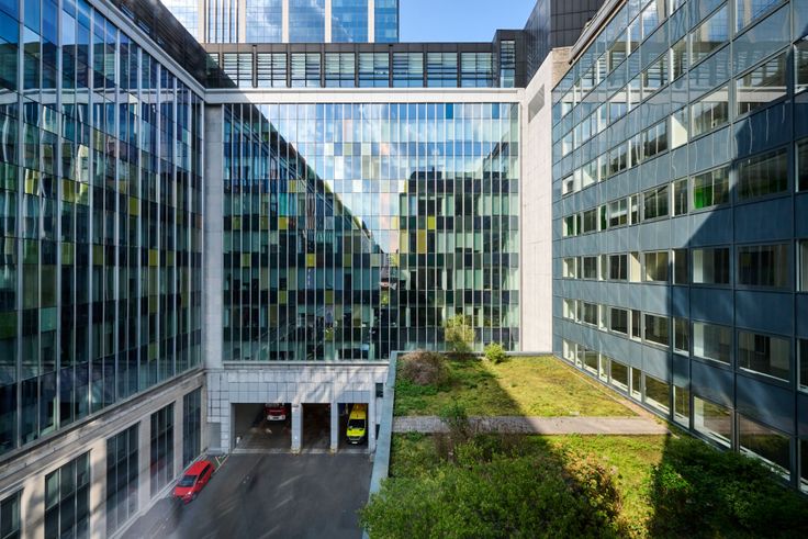 Op ondergrondse verdiepingen (1.267 m²) zijn de kantoren op 3 niveaus verdeeld en van ramen voorzien. Op de 1ste (1.811m²), 2de (2.336 m²), 3de (2.335 m²) en 4de (2.335 m²) verdiepingen zijn de kantoren met ramen voor-en achteraan en bevinden zich rondom twee atriums met voldoende privatief sanitair en diverse liften.