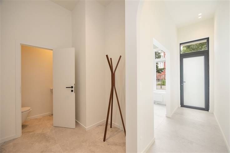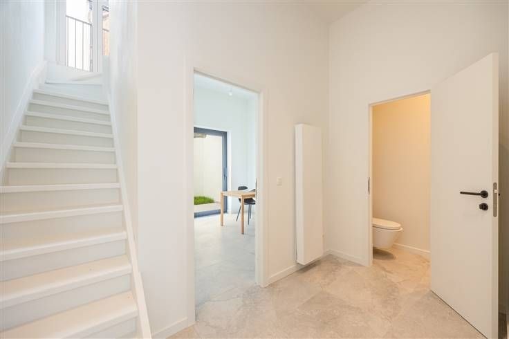 Een vernieuwbouw-huis dat volledig aangepakt werd met oog voor detail, dat krijg je hier. Denk: stijlvolle materialen, multifunctionele indeling én meerwaarde dankzij de vele stedenbouwkundige initiatieven op heden. Vooraan heb je een ruimte die kan dienen als kamer of fietsenstalling. Je hebt hier een aansluiting voor een was/droogcombinatie. Het gastentoilet bevindt zich halfweg de gang, met ruimte voor een vestiaire. De kamer achteraan kijkt uit op de stadstuin, die verlichting en stopcontacten heeft. Op de eerste verdieping kom je in de leefruimte met een doorlopende parketvloer en een U-vormige keuken. De geïnstalleerde kwaliteitskeuken heeft een strak composiet werkblad en Siemens-toestellen, een spoelbak en kraan in brons,inductievuur, dampkap, koelkast met diepvries en combioven. Op de tweede verdieping heb je een overloop met plaats voor een extra bergruimte. De eerste slaapkamer bevindt zich aan de straatkant, een tweede aan de achterzijde. Daartussen heb je de betegelde badkamer met een ligbad en glazen douchescherm, lavabo met spiegel en laden, hangtoilet, handdoekenradiator en automatische verluchting. Op de derde en bovenste verdieping heb je de master bedroom, met een ensuite badkamer en een dakterras op bankirai en nokhoogte van 4,95m. Je woont hier aan een pleintje, via een doorsteekje stap je in het Park Spoor Noord. Op 5 minuten ben je via de fietsbrug op het Eilandje. Meer info: https://www.immovasta.be/panden/gegevens/13655/