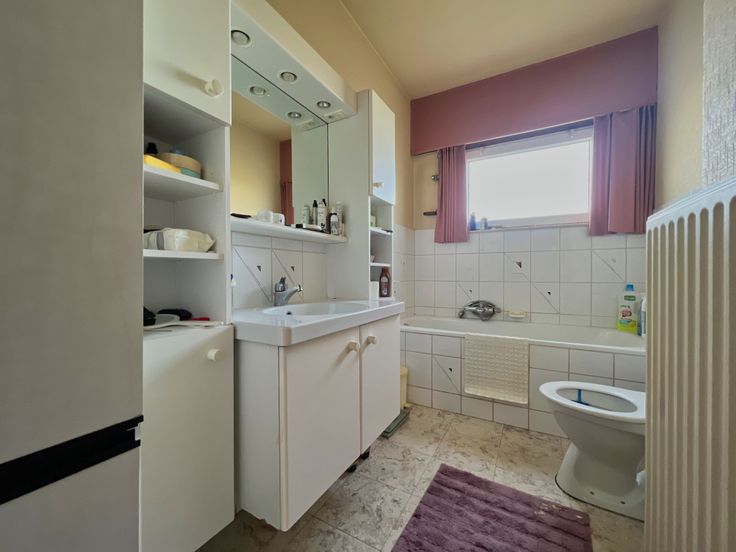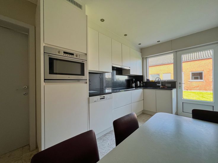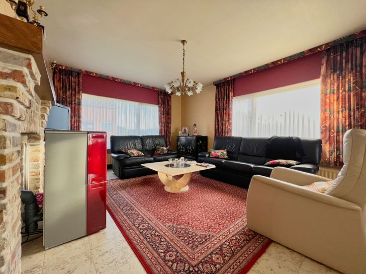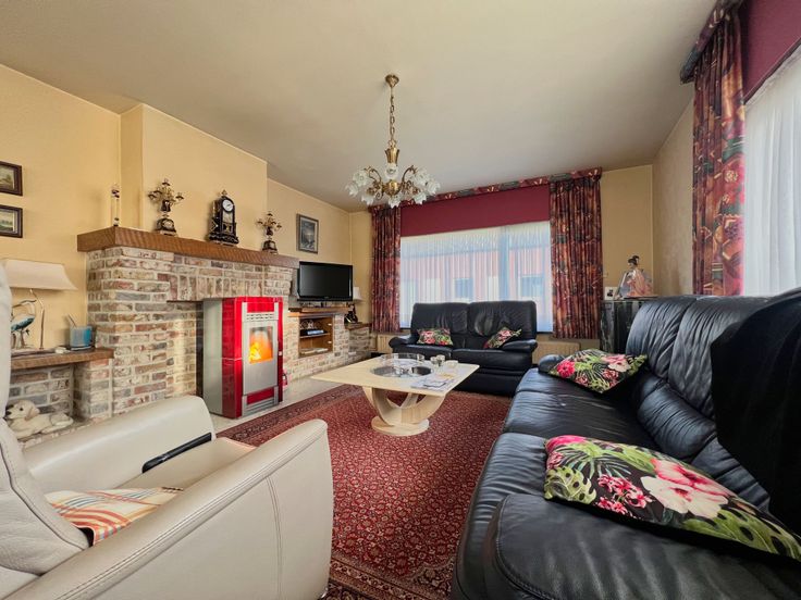 We treden de woning binnen via de inkomhal. De inkom biedt rechtstreeks toegang tot de lichtrijke leefruimte, bestaande uit een ruime zithoek met pelletkachel + eethoek. Aansluitend bevindt zich de ingerichte keuken. Verder beschikt het gelijkvloers over twee ruime slaapkamers, een badkamer + toegang tot een kelderruimte.