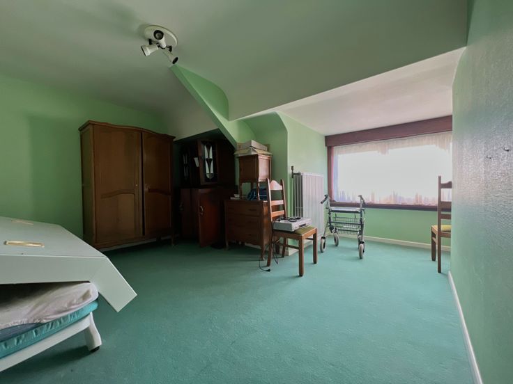 Via de trap in de inkomhal, bereiken we vervolgens het eerste verdiep. Het eerste verdiep bestaat uit een volwaardige slaapkamer + een ruime zolder (mogelijkheid tot extra kamer(s)).
