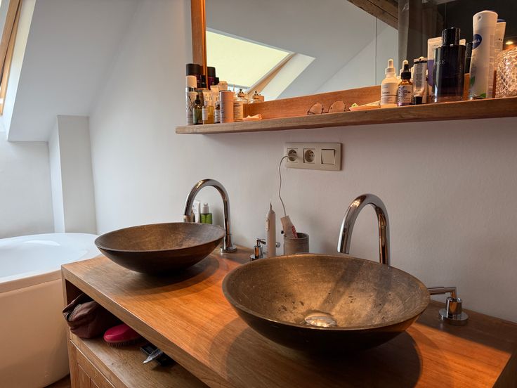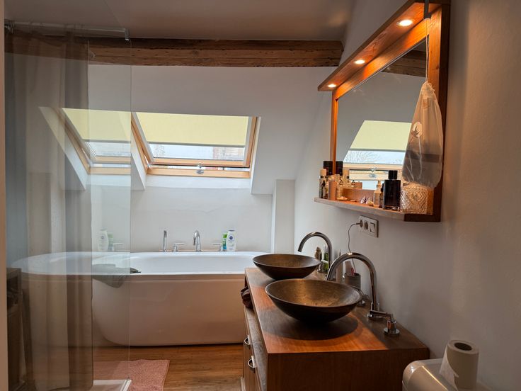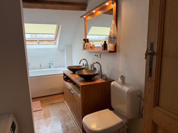 Au deuxième niveau: une chambre, une salle de bain avec baignoire et douche, une toilette, une deuxième chambre avec mezzanine.