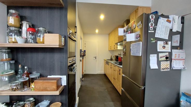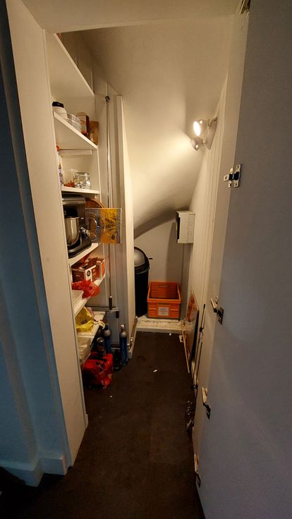 Aanpalend vindt u de open keuken met berging/ ingemaakte kast. Alle voorzieningen zijn aanwezig met plaats voor grote koelkast.