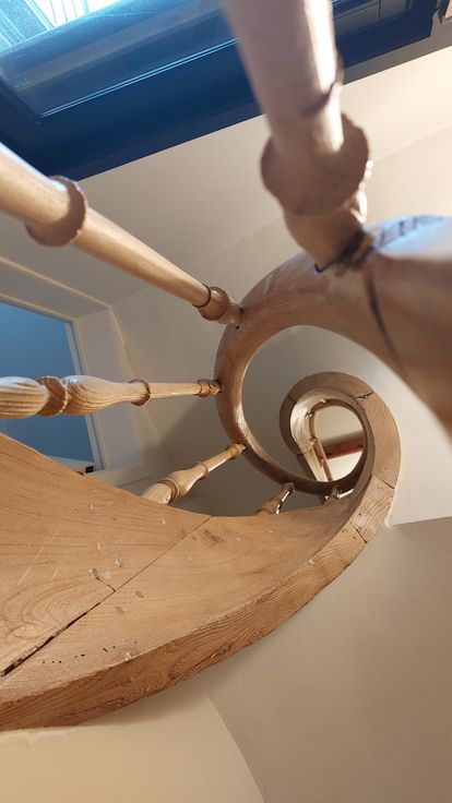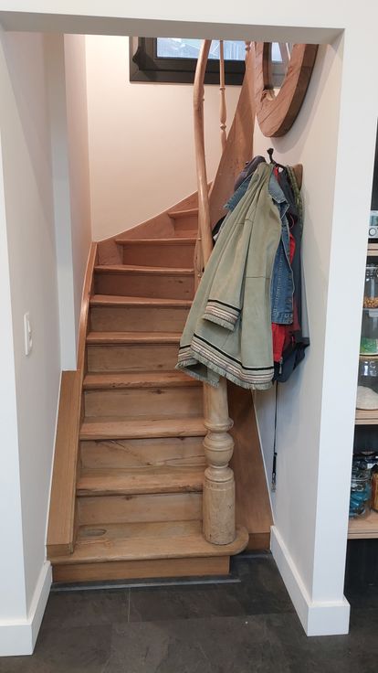 Via de gerenoveerde trap bereikt u de eerste kamer die nu gebruikt wordt als bureau.