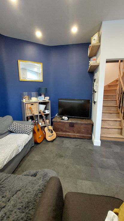 U betreedt het pand via de voordeur die uitkomt in de woonruimte. De prachtig gerenoveerde trap deelt de ruimte op in zit-en eetgedeelte.