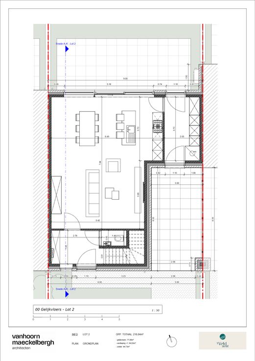 De woonoppervlakte van de woning omvat 216,64m². De indeling van de woning is slim en praktisch ontworpen. Op de gelijkvloerse verdieping kom je binnen in een uitnodigende inkomhal met een apart gastentoilet. Vanuit de hal bereik je de open leefruimte en keuken, een ideale plek voor gezellige momenten met familie of vrienden. Verder is er een handige berging aanwezig die aansluit op de carport.