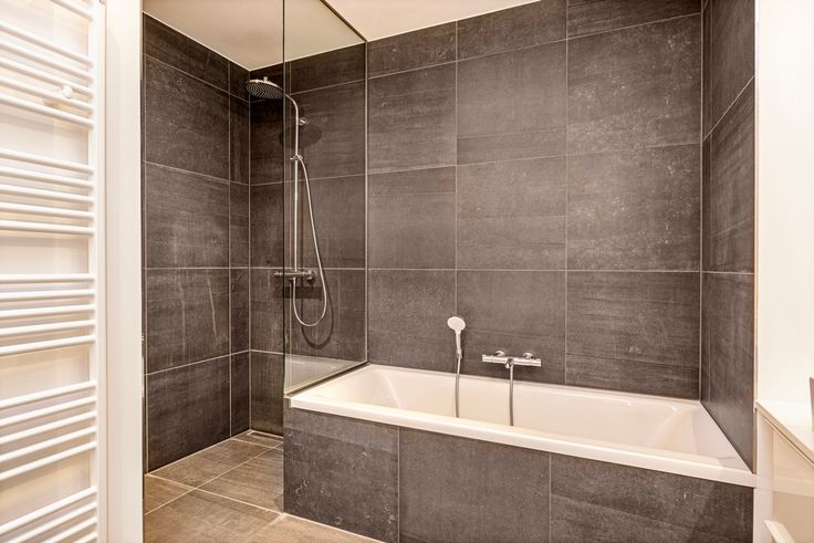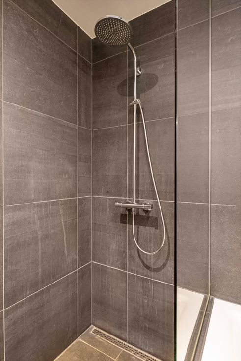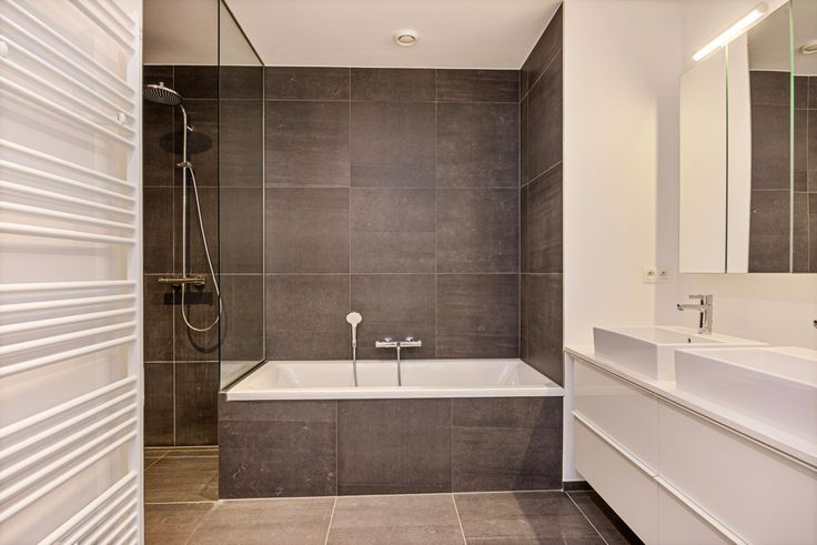 1 ruime badkamer met raam, bad, inloopdocue, 2 lavabos en kast met plaats voor wasmachine