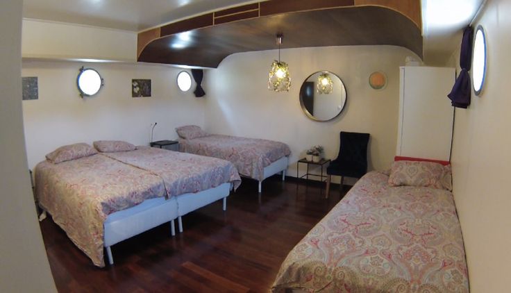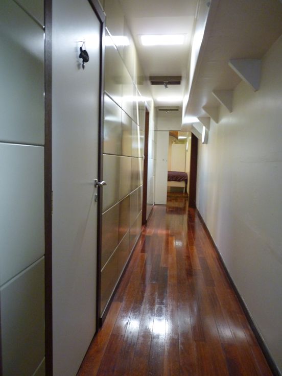 Het schip, van het type spits 39*5m, biedt 150m2 leefruimte, de technische ruimtes en 2 buitenterrassen niet meegerekend. Het interieur is elegant met zijn merbau vloer en comfortabel met een plafondhoogte van minstens 2,20 meter.