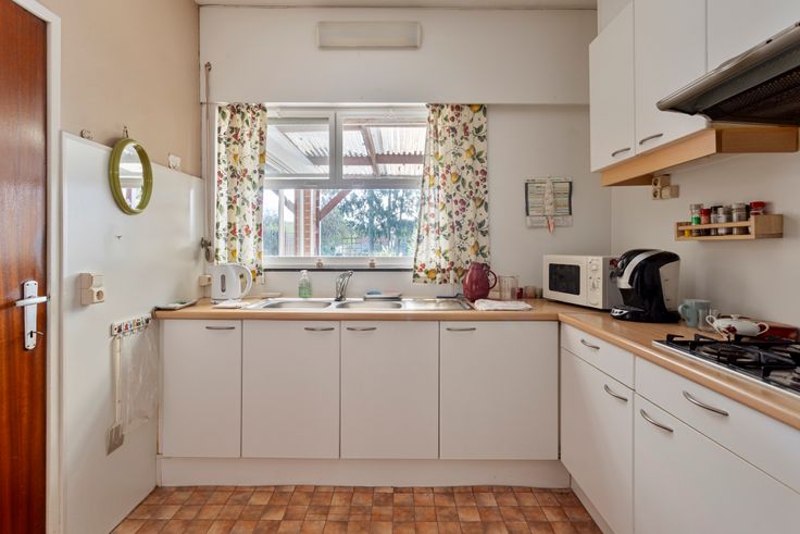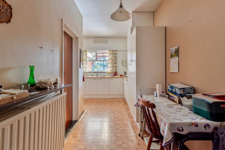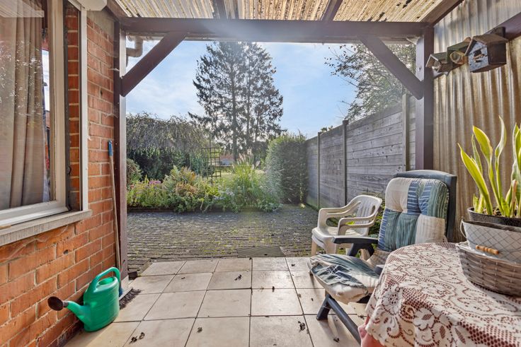 Ideaal als stockage of hobbyruimte.De woning zelf heeft volgende indeling: een inkomhal, zithoek aan de straatzijde en vervolgens de eetkamer met zicht op de tuin. De aparte keuken is eenvoudig ingericht.