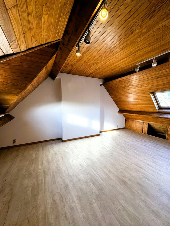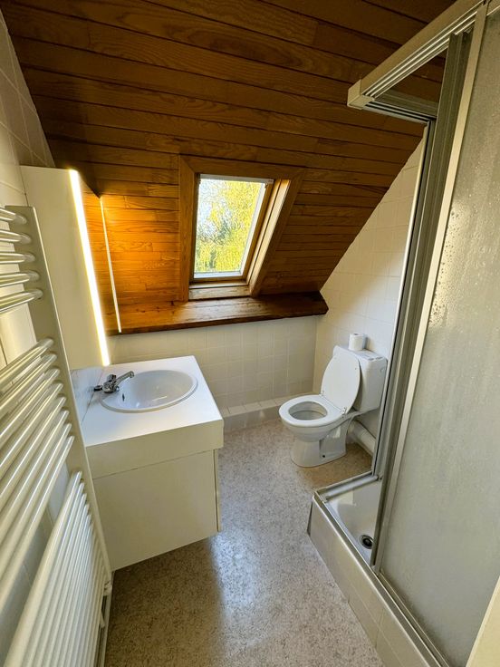 2e étage: Un dégagement d'escalier, une salle de douches (douche, lavabo, WC et mobilier) et une grande chambre parentale (25 m²) avec placards de rangement et pouvant être scindée en deux chambres à coucher de 12 et 13 m².