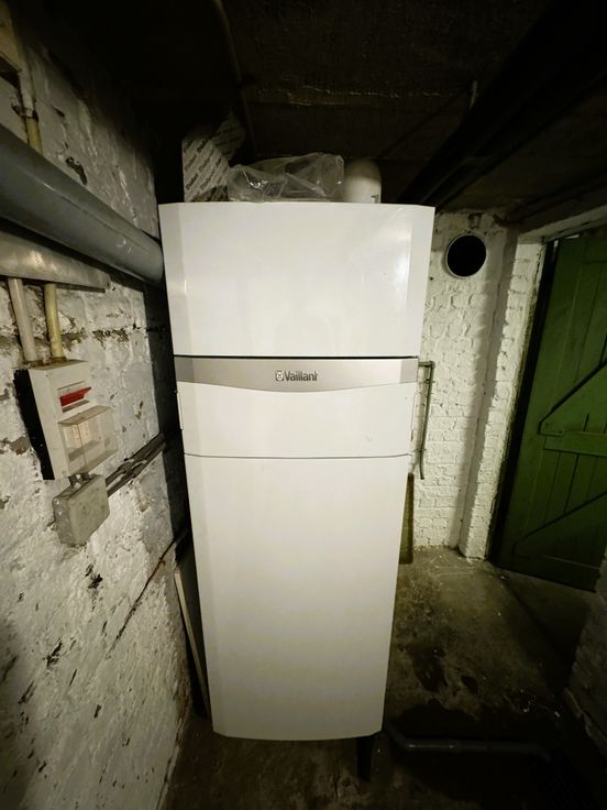 Sous-sols: Un dégagement d'escalier, une cave avec adoucisseur, une buanderie et une chaufferie avec chaudière au gaz datant de 2020.