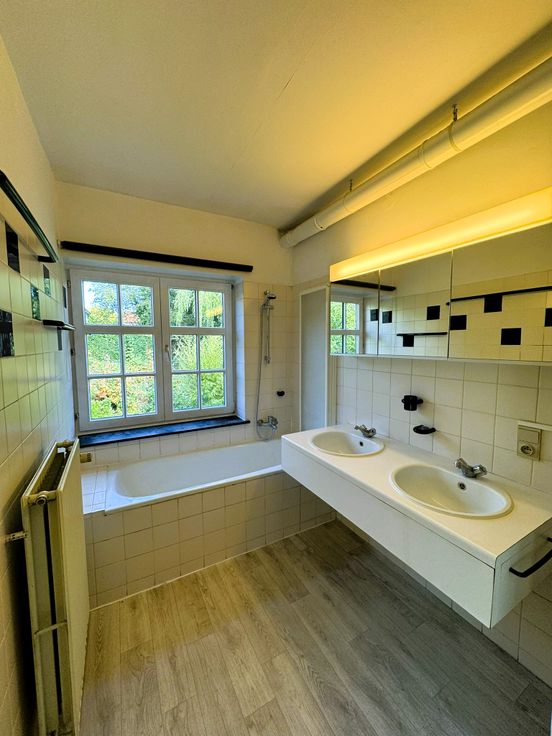 1er étage: Un dégagement d'escalier, un hall de nuit, une salle de bains (bain, double lavabo, WC et mobilier), une grande et lumineuse chambre à coucher (21 m²) pouvant être scindée en deux chambres à coucher de 10 et 11 m².