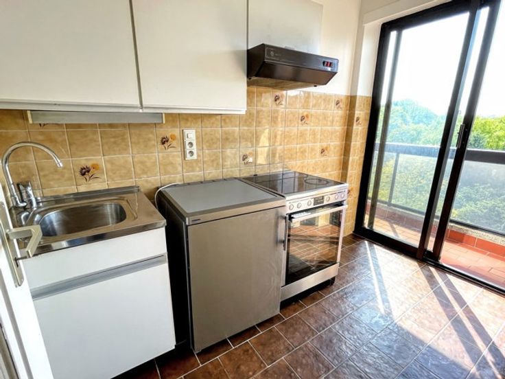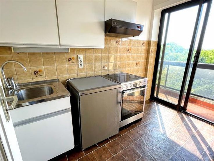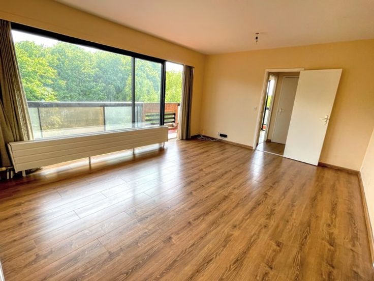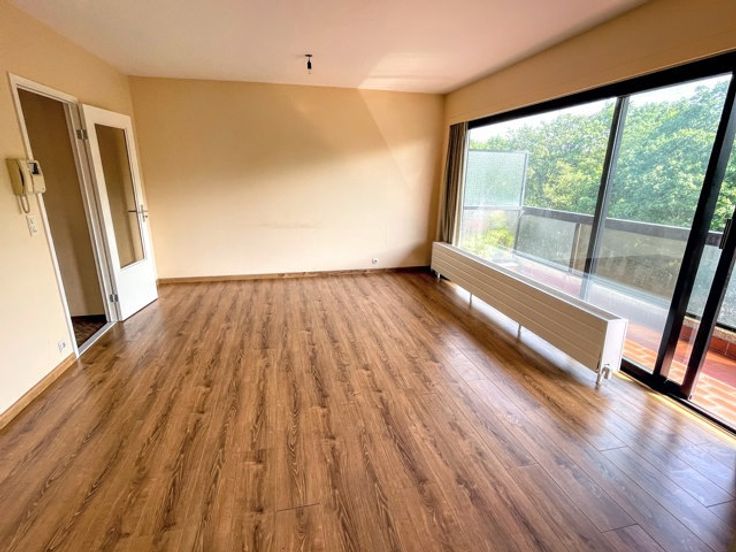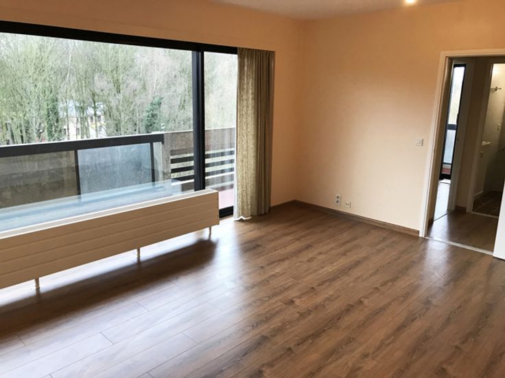 Place Keym / Etang des Pêcheries. Aantrekkelijk, licht studio-appartement (geen aparte slaapkamer) in een residentie met privépark. Woonkamer, ingerichte keuken, badkamer, hal met bergruimte en apart toilet. Privékelder. Kosten: 150 €/maand (communs + voorziening voor verwarming en water in het appartement). Garagebox beschikbaar. Een must see. 0032.495.53.41.10
