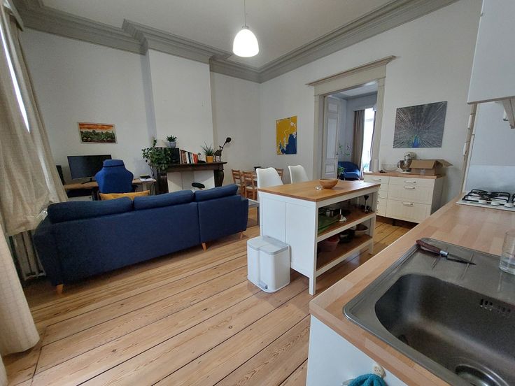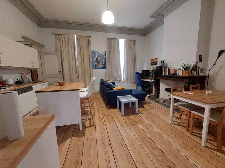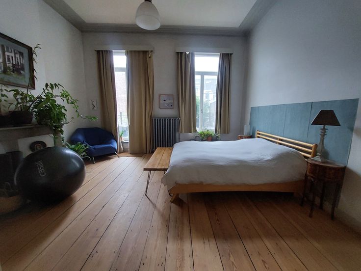 Grand apartement 85m2, 1 chambre, meuble, 1er etage dans une immeuble manor, 1905, avec character, parquet, haut plafond, moulure, lumineuse, grand terrace 40m2 au soleil dans l'apres-midi/soir. Rue tranquille. 1 lit 1.60x2m2 Queen, plus canape lit pour les inviter.