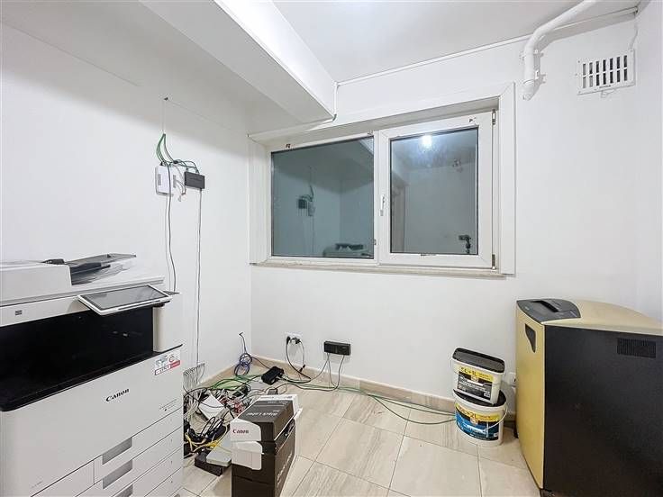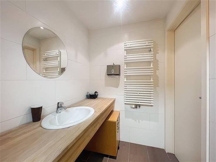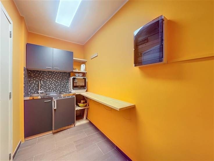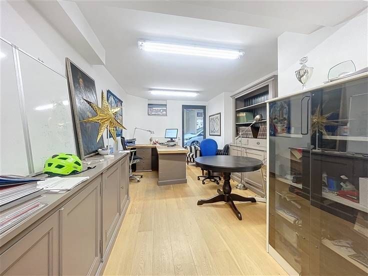 Dit kantoor is ideaal voor een vrij beroep of een tandartspraktijk en bevindt zich in een luxe gebouw. Het bestaat uit een begane grond met een hal die kan worden gebruikt als receptie of wachtruimte, een kantoor dat uitkomt op de straat, een grote open ruimte van ongeveer 40 m² met directe toegang tot de tuin en het terras, een keukenruimte en een toilet met wastafel. Twee parkeerplaatsen zijn optioneel beschikbaar, voor €25.000 per stuk, met directe toegang tot het kantoor. De kelder biedt een grote opslagkelder van ca. 30 m², ideaal voor archieven
