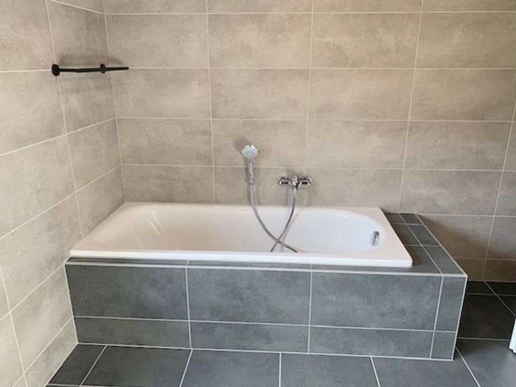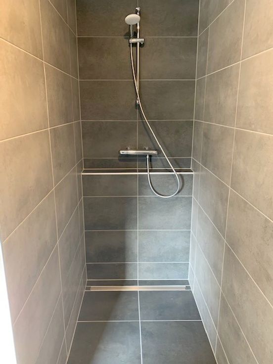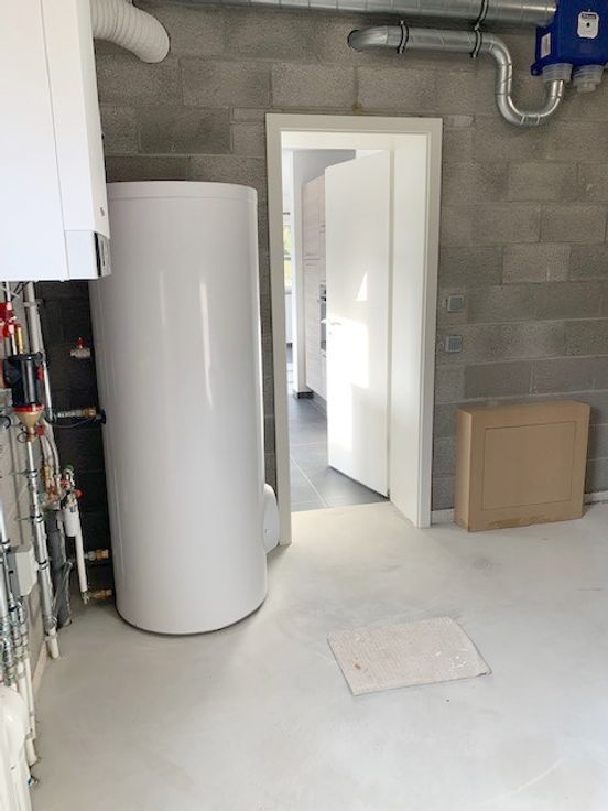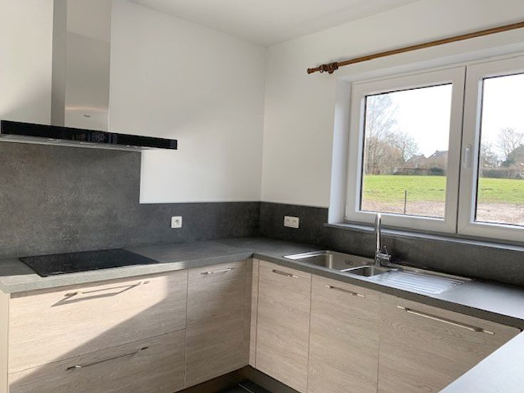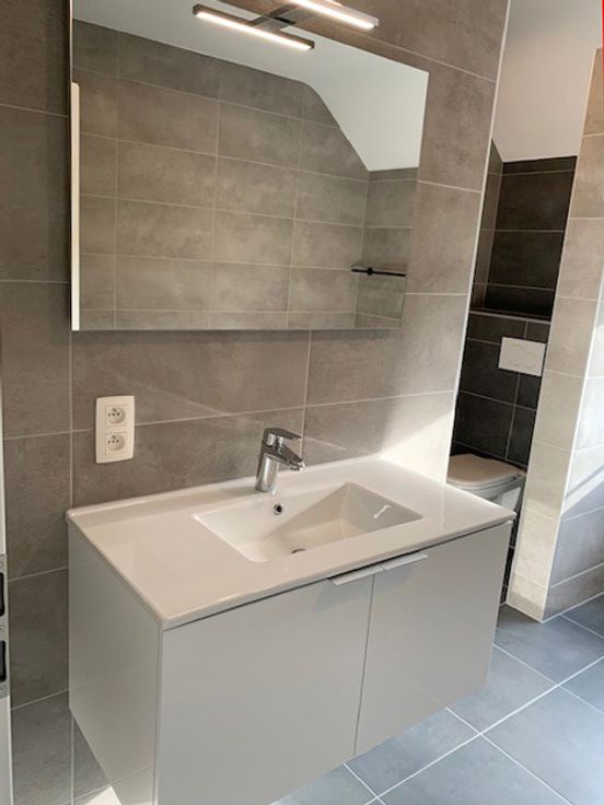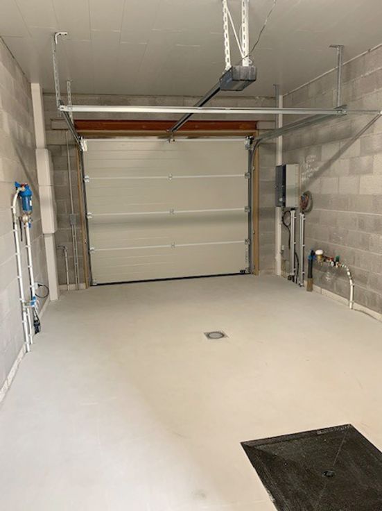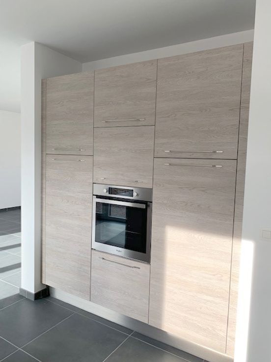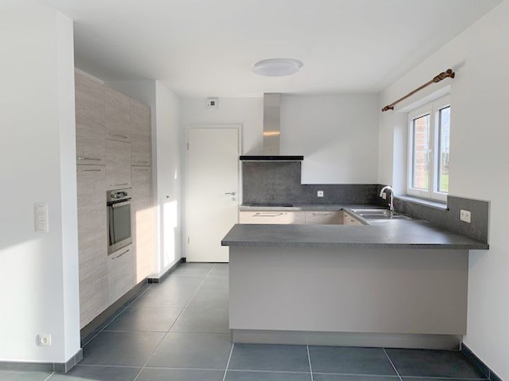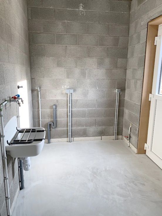 *Rdc : hall d'entrée, spacieux et lumineux living de 40m² avec cuisine hyper équipée ouverte (meubles, taque vitro induction, hotte, four, évier, l-v et frigo), wc séparé, buanderie et garage de 18m² avec porte sectionnelle électrique.
