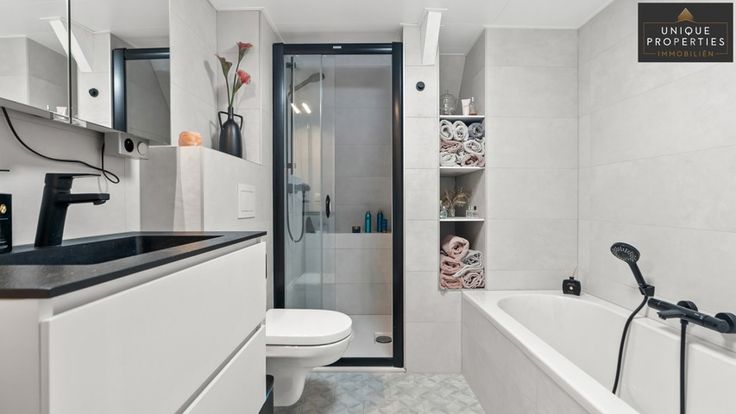 Badkamer: Stijlvol ingericht met douche en ligbad, compleet in hoogwaardige materialen.