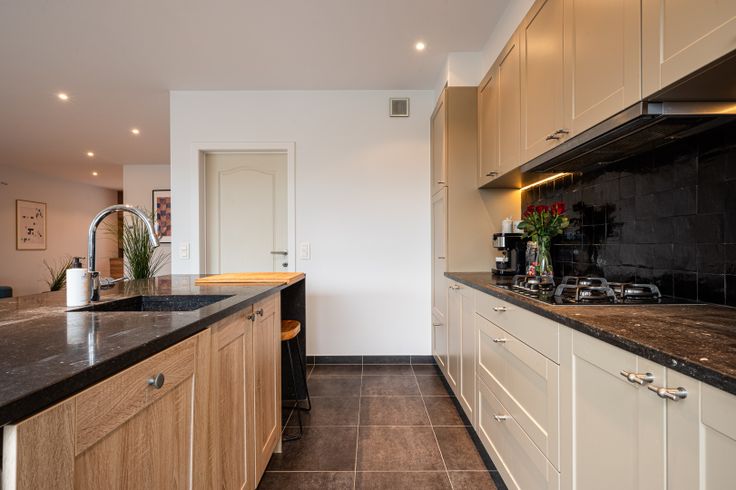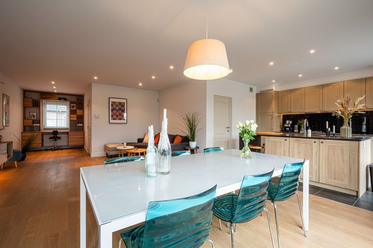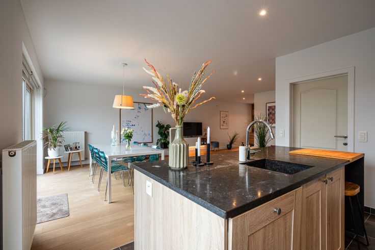 • Gelijkvloers: U wordt verwelkomd in een ruime inkomhal met gastentoilet. De lichtrijke woonkamer is slim ingedeeld in een bureauruimte, zithoek en eetplaats. Aansluitend bevindt zich de open, volledig geïnstalleerde keuken, waar ook ruimte is om te ontbijten. De inpandige en praktische garage biedt plaats voor uw wasmachine en droogkast.
