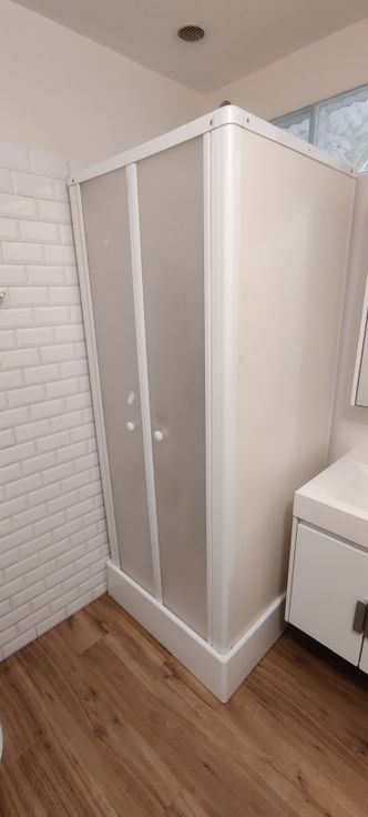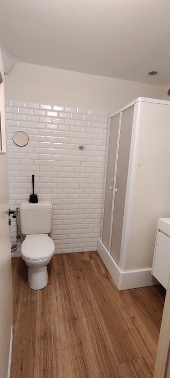 SDB avec douche, lavabo et WC.