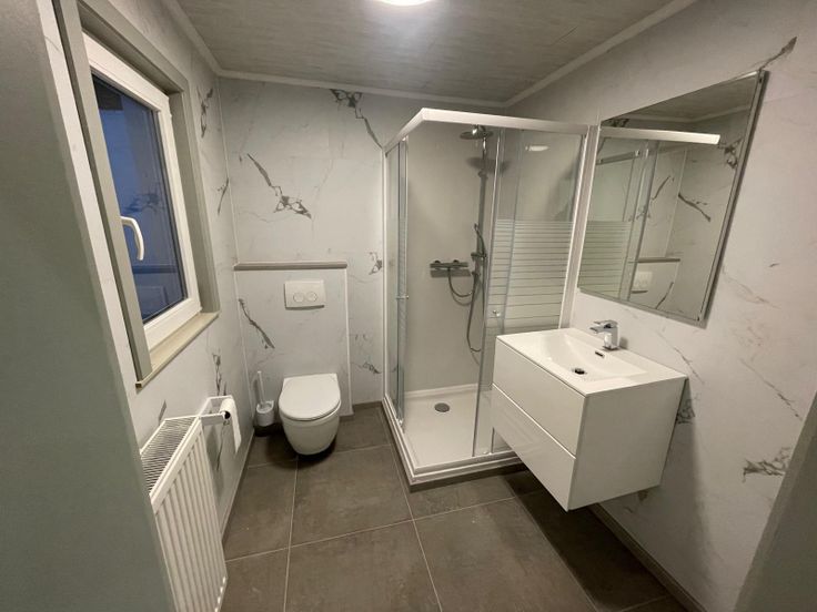 - Badkamer: uitgerust met douche, lavabo en toilet