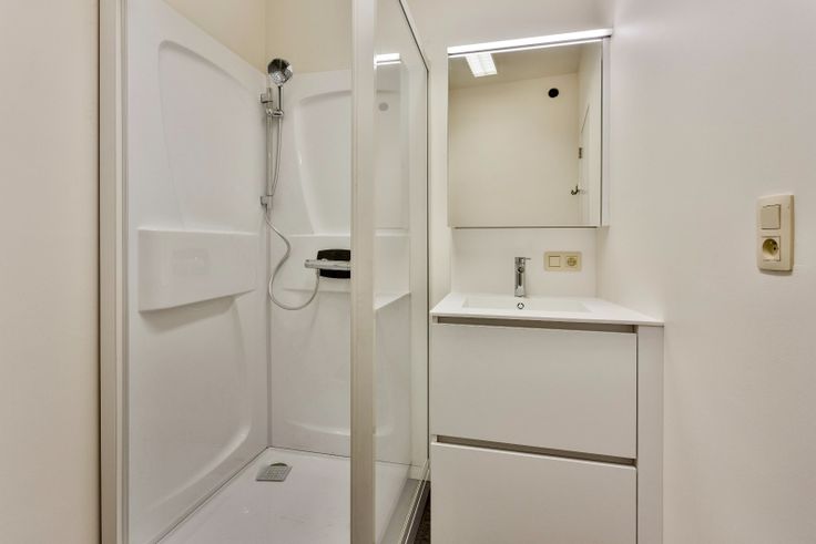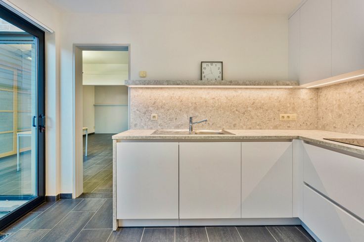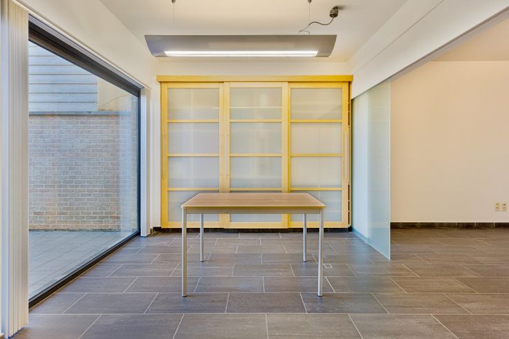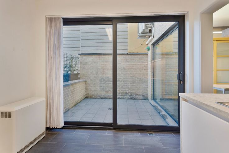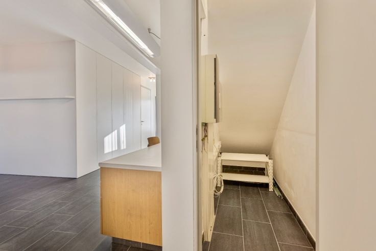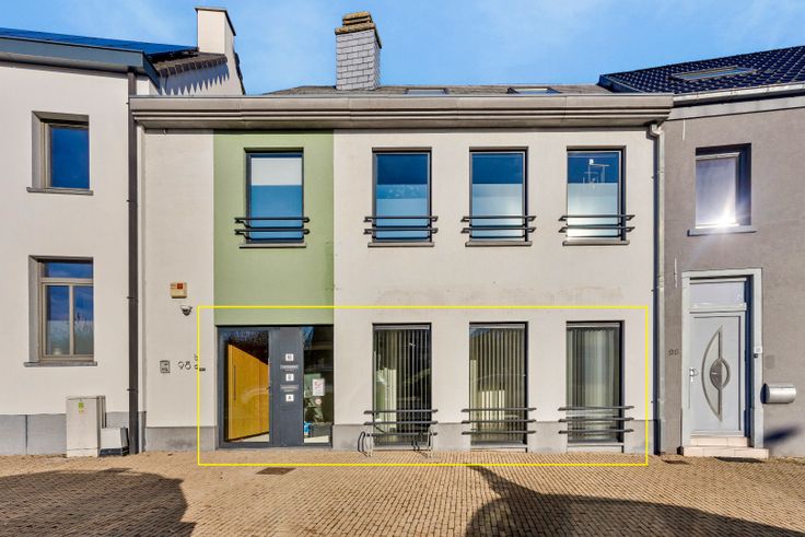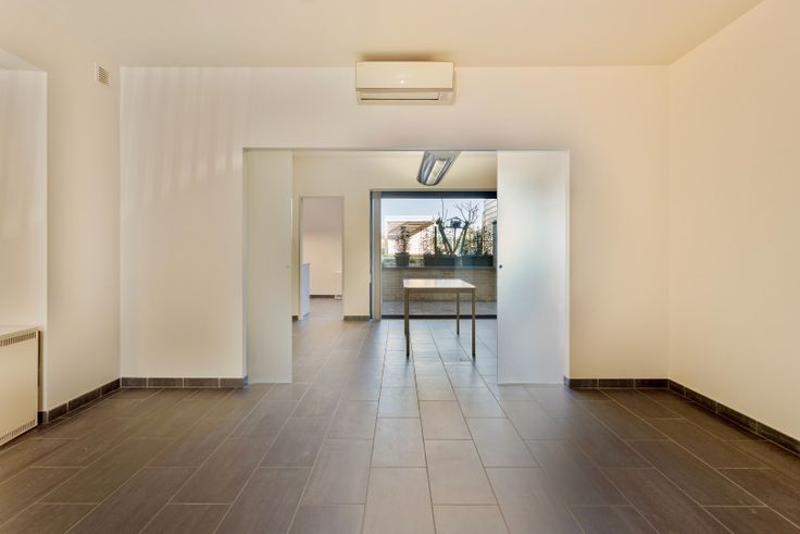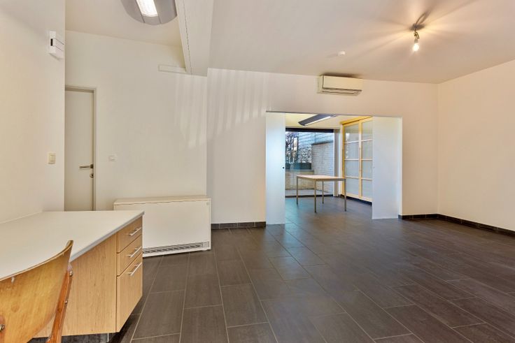 Het appartement is als volgt ingedeeld: we komen binnen in de leefruimte, met plaats voor salon en bureau, een berging en een apart toilet, daarna lopen we door naar de eetplaats met ingemaakte kast, doorgang naar de badkamer, voorzien van douche, lavabo en aansluitingen voor de wasmachine en droogkast. We treffen er verder nog de splinternieuwe ingerichte keuken, met doorgang naar de koer via een groot schuifraam.