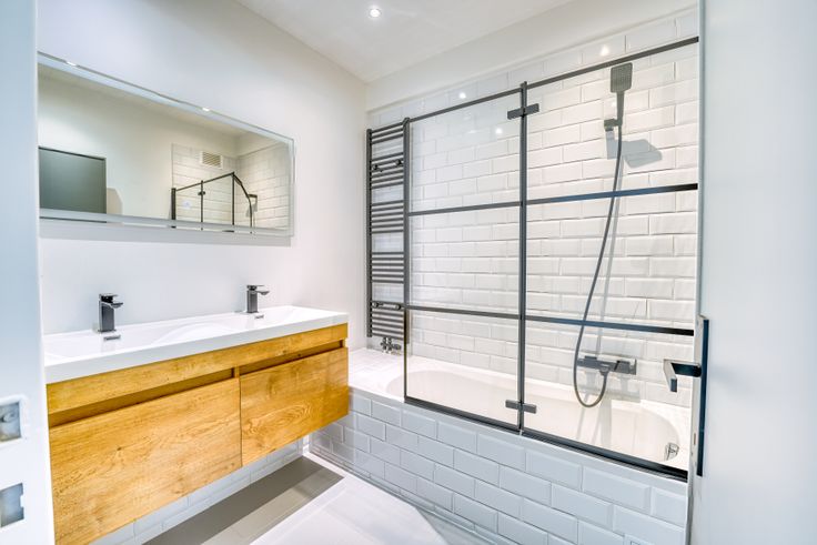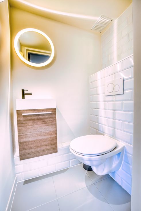 De moderne badkamer heeft een dubbele lavabo en een volledig betegeld bad met douchefunctie en glazen douchescherm. WC apart in de gang bij de slaapkamers.