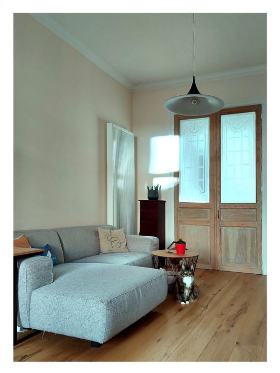 Je komt dit prachtig gerenoveerde appartement binnen via de ruime woon/eetkamer, die naadloos overgaat in een volledig uitgeruste open keuken. De grote slaapkamer, verborgen achter indrukwekkende oude houten deuren, biedt uitzicht op het groene buitengebied. Een andere houten deur geeft toegang tot de badkamer, die is uitgerust met een ligbad en een aansluiting voor de wasmachine. Vanuit de badkamer kom je in de tweede slaapkamer, die ook uitstekend als werkkamer en/of dressing kan dienen. Ook deze kamer heeft uitzicht op het groen.
